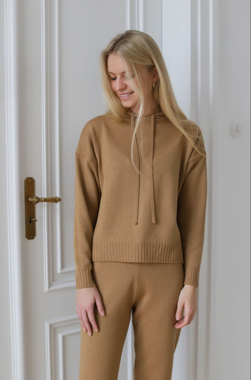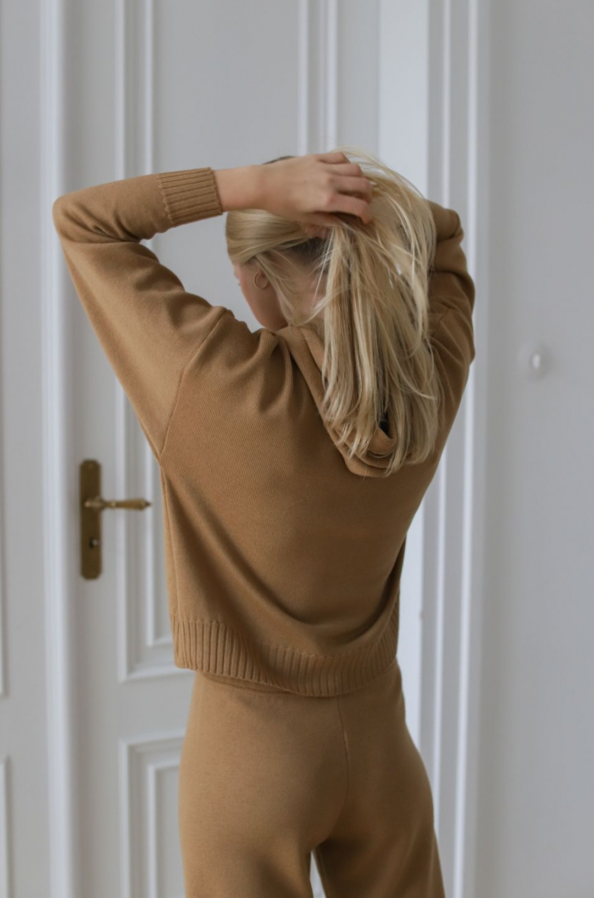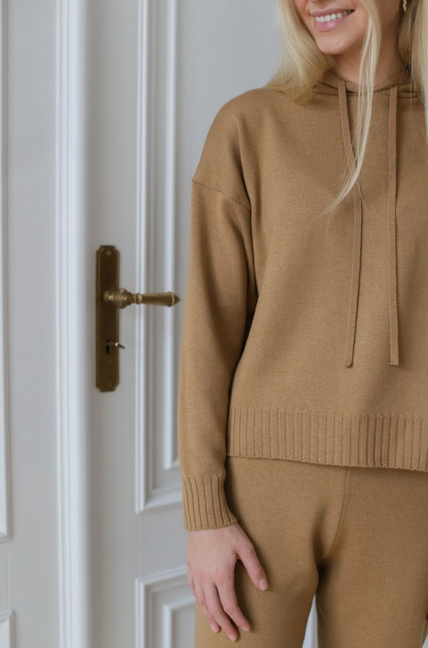 Ten sezon bezapelacyjnie należy do dresów. Lubimy ciepłe rzeczy, a jednocześnie powoli tęsknimy za wiosną, dlatego stworzyliśmy bluzę zarówno dla tych, których nie chcą rezygnować z ciepłych rzeczy, a jednocześnie myślami są już w kolejnej porze roku. Bluza z kapturem została wykonana z wysokiej jakości oddychającej wełny merynosowej w pięknym odcieniu karmelu. Klasyczny krój ze ściągaczami na dole i w rękawach oraz opuszczoną linią ramienia, zapewnia komfort noszenia. Kaptur uzupełniają troczki również wykonane z dzianiny, nadając całości minimalistycznego charakteru. Długość do bioder odnajdzie się zarówno w zestawie ze spodniami do kompletu, ale również z jeansami czy spódnicą.