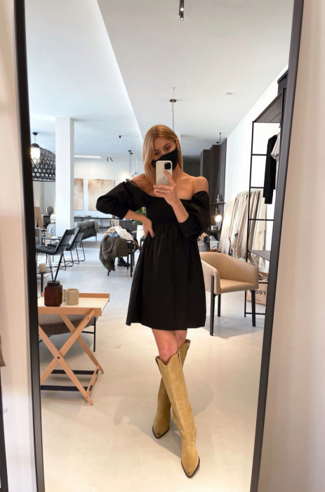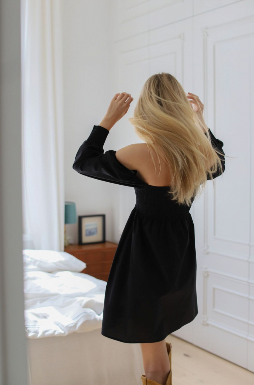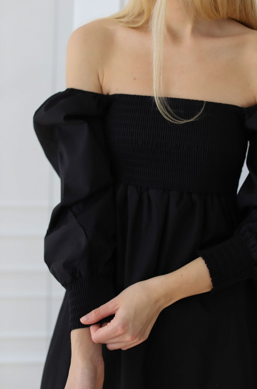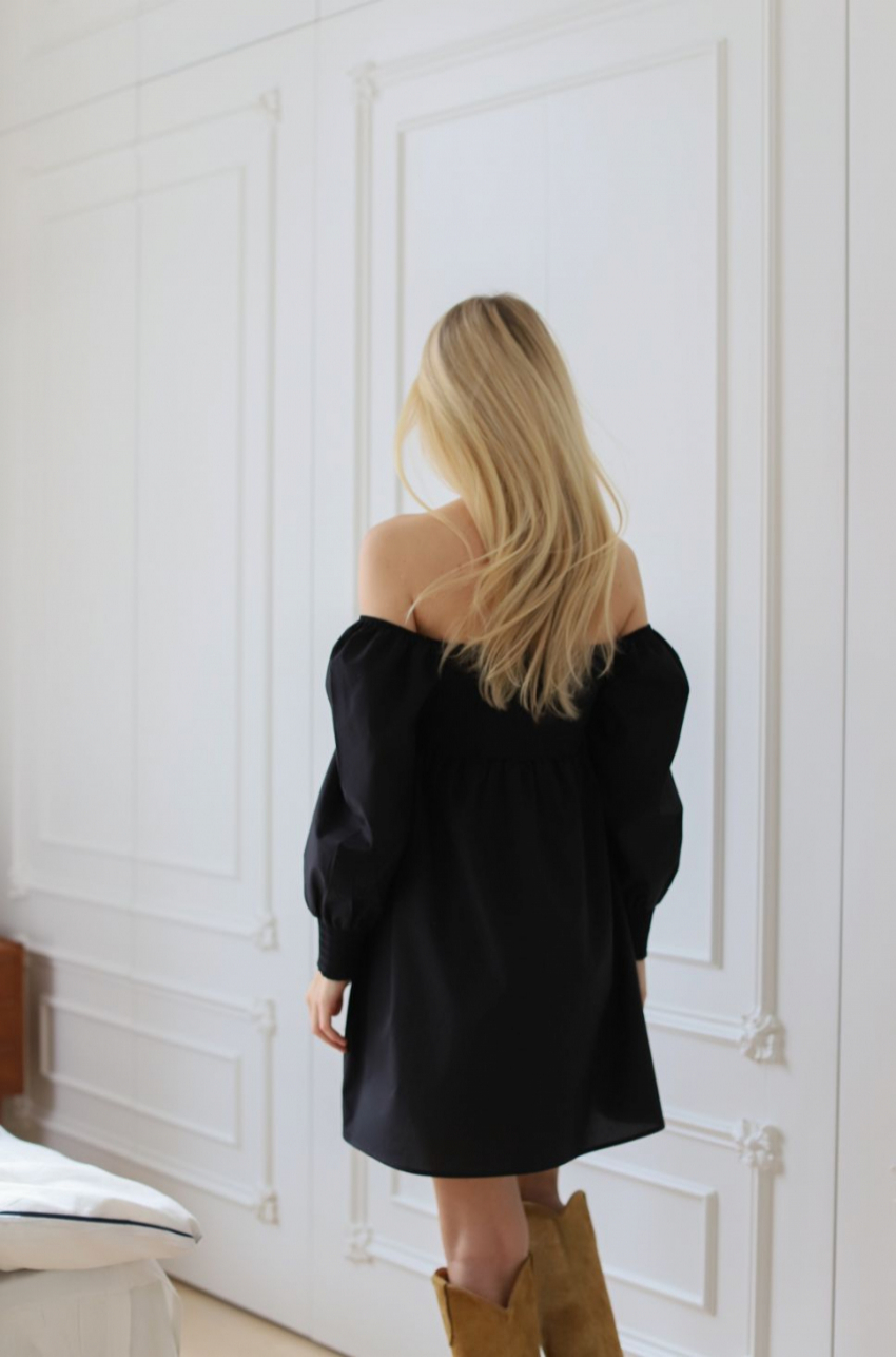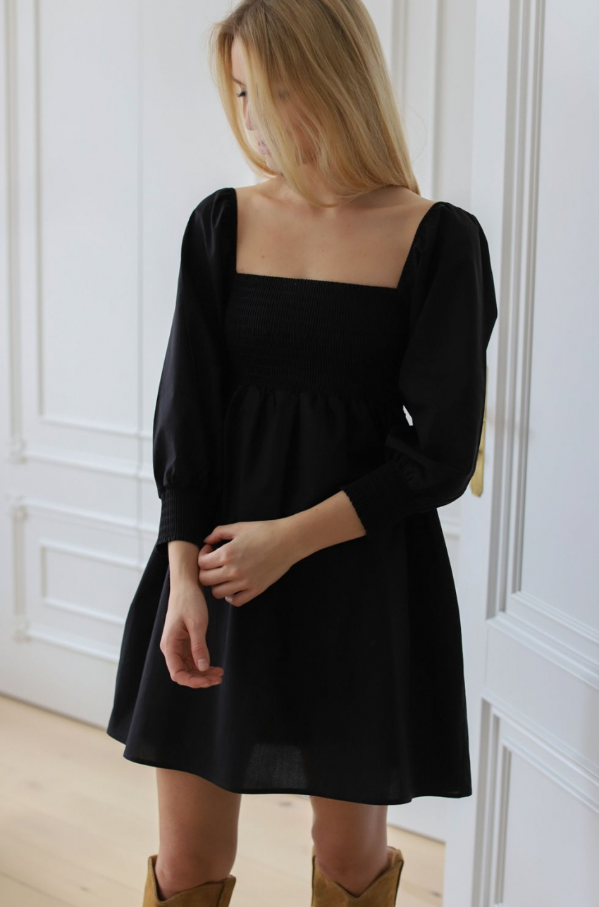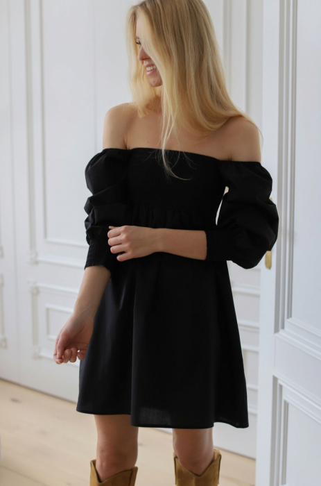Sukienka odszyta z oddychającej bawełnianej tkaniny to obowiązkowy element naszej sezonowej garderoby. Nasz nowy model można nosić z opuszczonym rękawem, eksponując ramiona jak i w klasycznym wydaniu. Przeszycie gumką na wysokości biustu i w rękawie pozwala idealnie dopasować krój i nadać mu pożądaną formę. Rozkloszowany dół o długości do połowy uda optycznie wydłuża sylwetkę i pasuje zarówno do kozaków jak i sandałków i sportowych butów. Klasyczny czarny kolor sprawia, że sukienka odnajdzie się zarówno we wiosennych jak i letnich zestawach.