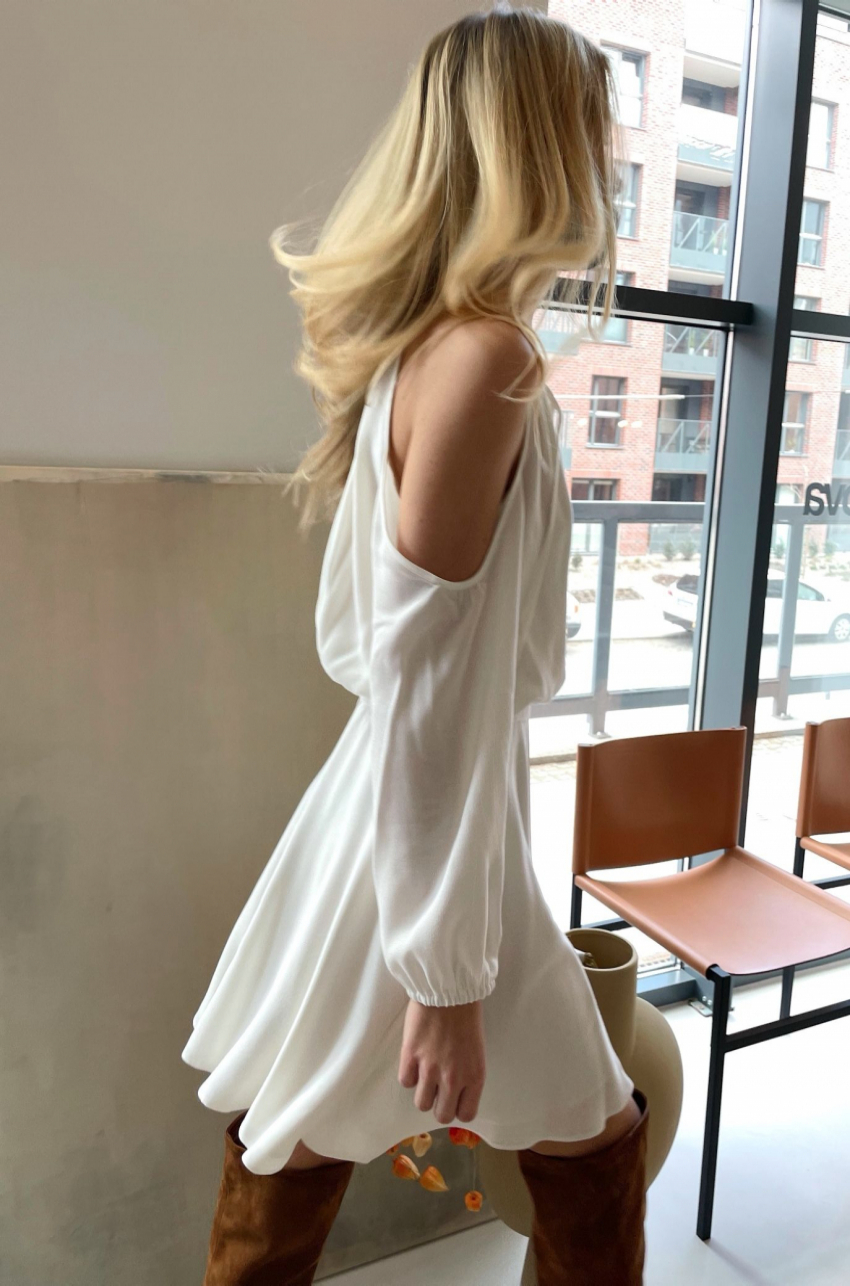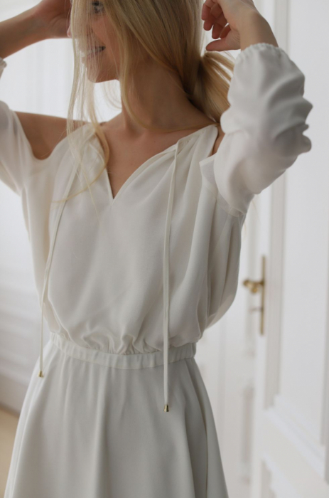 Zebrane w talii, zwiewne formy z tkaniny wiskozowej to nasz ulubiony typ letnich sukienek, ponieważ sprawdza się równie dobrze w upalny dzień jak i podczas wieczornego wyjścia na kolację czy imprezę. Nasza propozycja łączy w sobie zalety modelu na ramiączkach i tego z rękawem, a to za sprawą charakterystycznych rozcięć na ramionach. Góra została wykończona cienką pliską oraz troczkami z eleganckimi, złotymi końcówkami. Można je nosić związane lub luźno puszczone, eksponując tym samym dekolt. Delikatne gumeczki w rękawach i szersza gumka w talii zapewniają formie odpowiednie proporcje. "Kropką nad i” tego letniego modelu jest subtelne rozcięcie z tyłu. Sukienka posiada bawełnianą podszewkę, która zwiększa komfort noszenia i sprawia, że nic nie prześwituje.